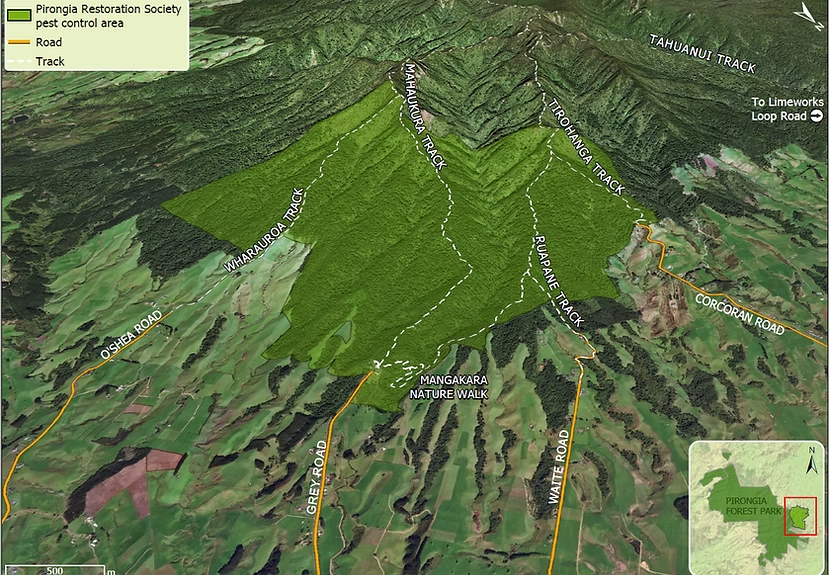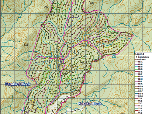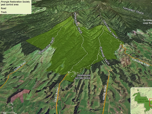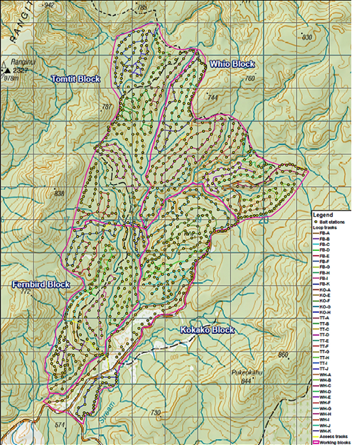 The Okahukura Block is located in North Pureora Forest. 1000 Hectares , is under pest control management using the same bait stations as Pirongia. This ongoing operation was initiated to support the forest area that provides Kookako for translocation to Pirongia.